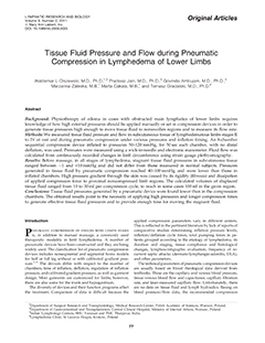 Tissue Fluid Pressure and Flow during Pneumatic Compression in Lymphedema of Lower Limbs Abstract Background: Physiotherapy of edema in cases with obstructed main lymphatics of lower limbs requires knowledge of how high external pressures should be applied manually or set in compression devices in order to generate tissue pressures high enough to move tissue fluid to nonswollen regions and to measure its flow rate. Methods: We measured tissue fluid pressure and flow in subcutaneous tissue of lymphedematous limbs stages II to IV at rest and during pneumatic compression under various pressures and inflation timing. An 8-chamber sequential compression device inflated to pressures 50–120 mmHg, for 50 sec each chamber, with no distal deflation, was used. Pressures were measured using a wick-in-needle and electronic manometer. Fluid flow was calculated from continuously recorded changes in limb circumference using strain gauge plethysmography.